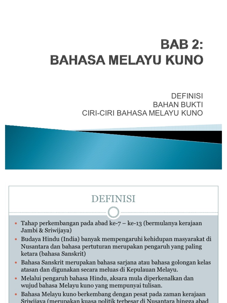 Bentuk paling awal dalam bahasa Jawa Kuno yang terlestarikan pada tulisan yakni ada pada Prasasti Sukabumi yang berasal dari tahun 804 Masehi. 6 12 Bahasa Melayu Kuno 121 Konsep Bahasa Melayu Kuno 122 Ciri Bahasa Melayu Kuno Berkembang di Nusantara pada abad ke-7 hingga abad ke-13 Penuturnya tinggal di sekitar Semenanjung Tanah Melayu Kepulauan Riau dan Sumatera Dipengaruhi oleh bahasa Sanskrit kerana. Kemudian hikayat banyak mengalami proses adaptasi dan terjemahan ke dalam Bahasa Indonesia dengan tujuan agar pembaca dapat lebih memahami isi dari hikayat tersebut.